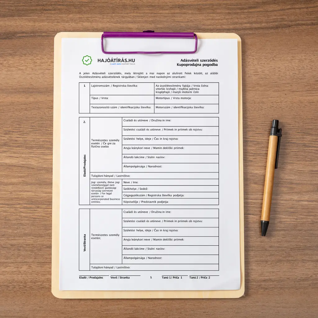 Kétnyelvű hajó adásvételi szerződés (szlovén-magyar) (nyomtatás után, tollal kitölthető) mennyiség